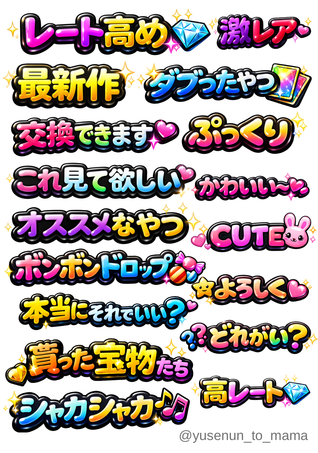 2026/02/04 ほしい募集中 『シール交換の時のセリフ』シール ゆせママ シール交換をするときに、「それ、レート高いよ」「それ、人から貰ったやつだよ」など、よく使われるセリフがあると思います。その“よく言うセリフ”を、子どもにも分かりやすい文字シールにしたらどうかな?と思い、提案させていただきました!イメージを自作してみましたので添付のイメージ画像もご確認いただけますと幸いです。#シール交換