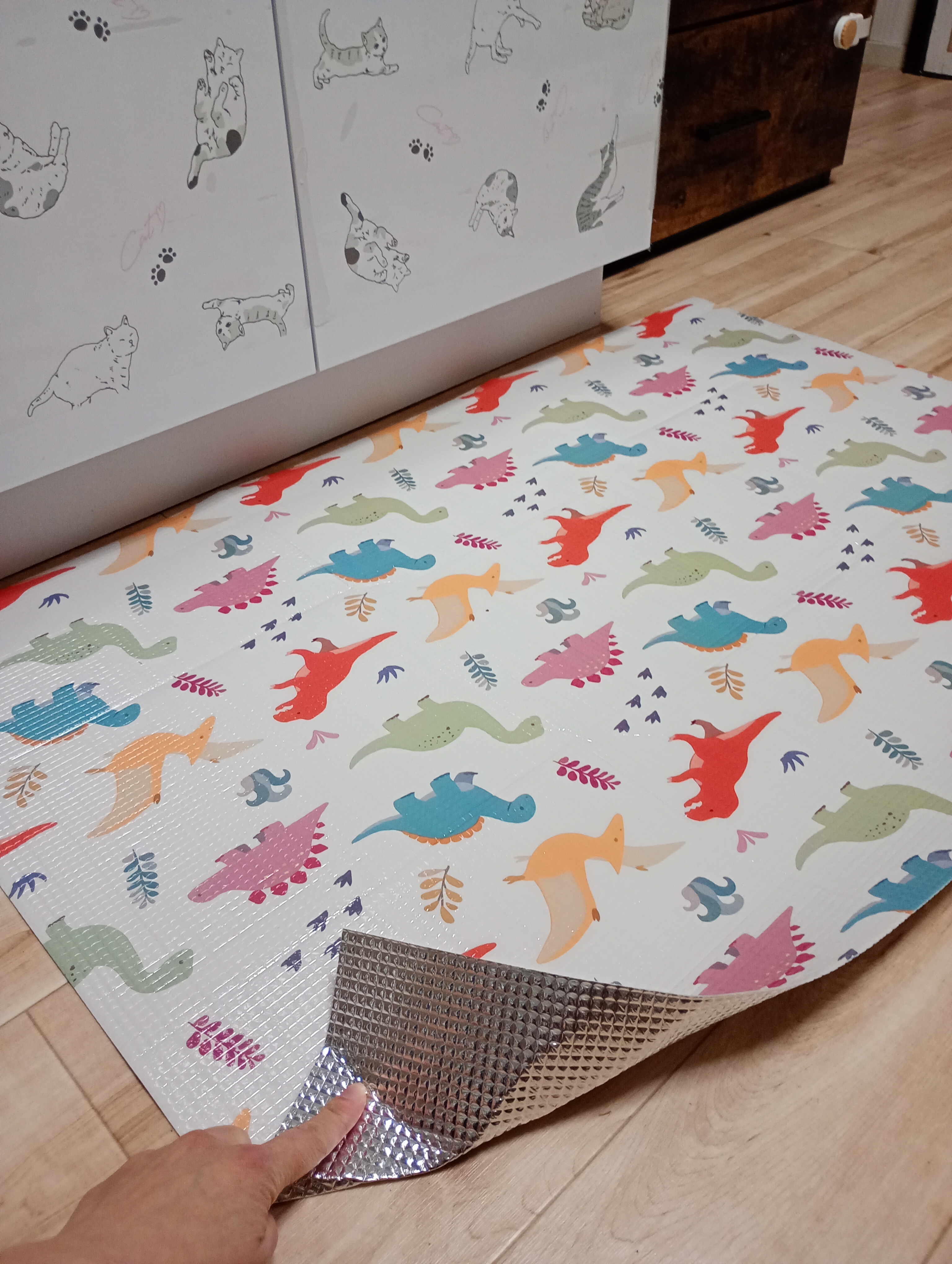 2026/02/11 ほしい募集中 アルミ断熱マット べえちゃん アルミ断熱シートの片面が木目調の物が欲しいです。床にキッチンマットの変わりに敷いたり、足元の寒さが気になるところに敷きたいです。洗濯要らずでお手入れも簡単。似たものにアルミ断熱レジャーシートがあります。これを台所に敷くと写真のようになります。床全体に敷いて暖かい部屋を作りたいので、部屋に馴染む木目調を探しましたが、ありません。作って下さい。