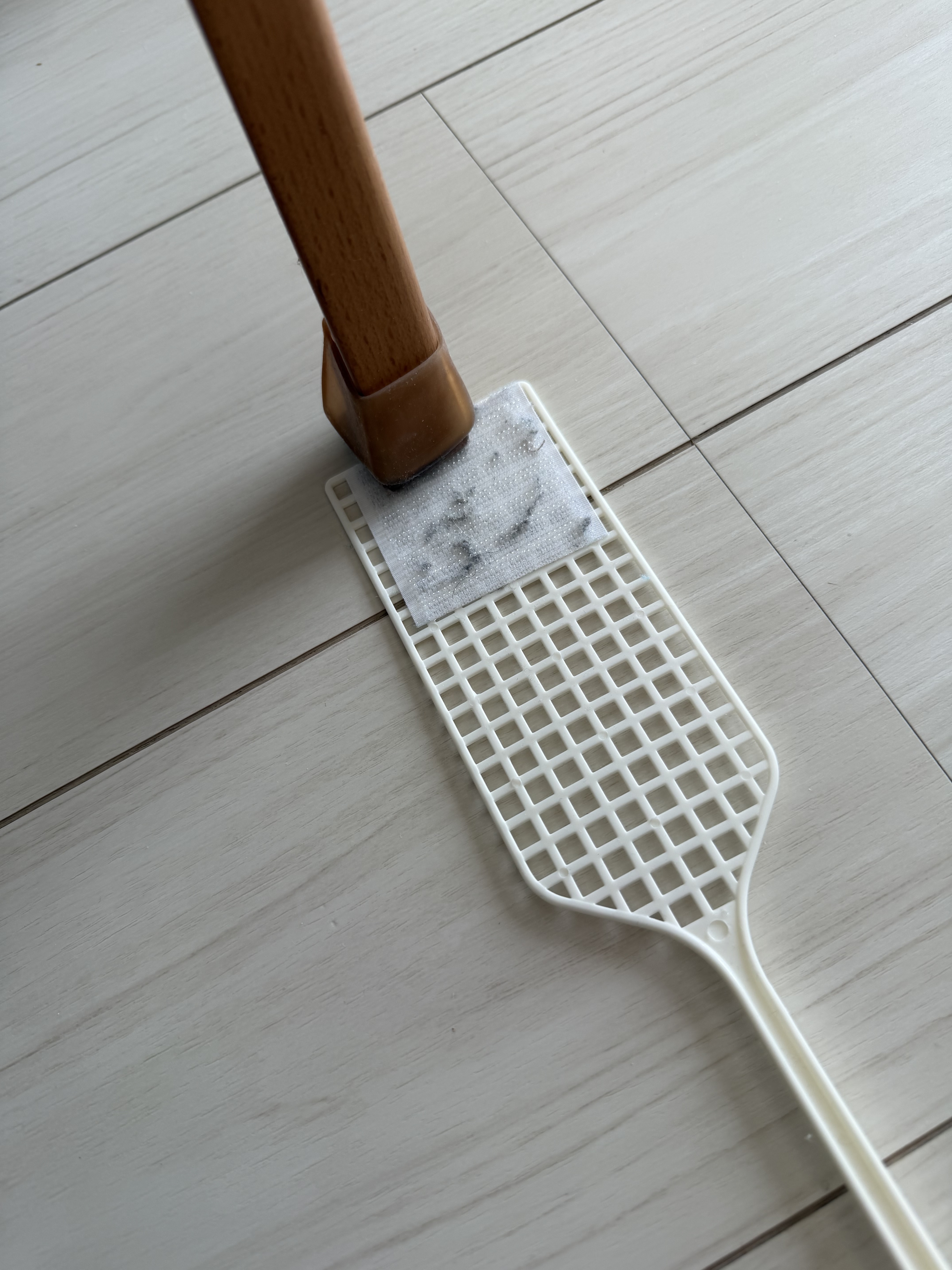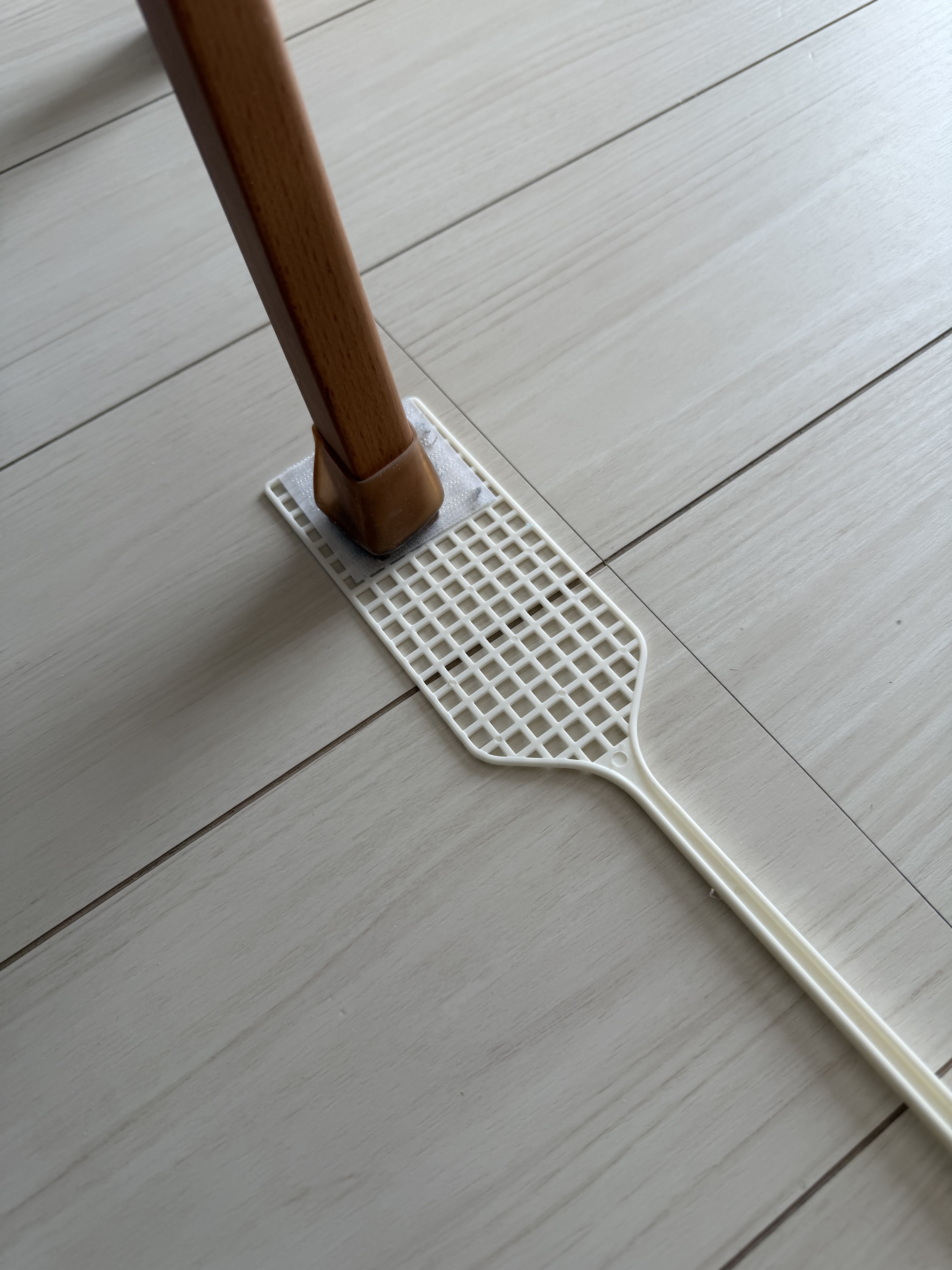 今朝も、まただと思い脚の裏に溜まる埃取りが掃除機で床の掃除の手を止めて拭かなくてはならず、屈むのがめんどい私は、セリアのスキマモップの水色のマイクロファイバーを外し、このモップに手芸用のマジックテープのざらついた方を貼ってイス脚の下に起き引いてみました。