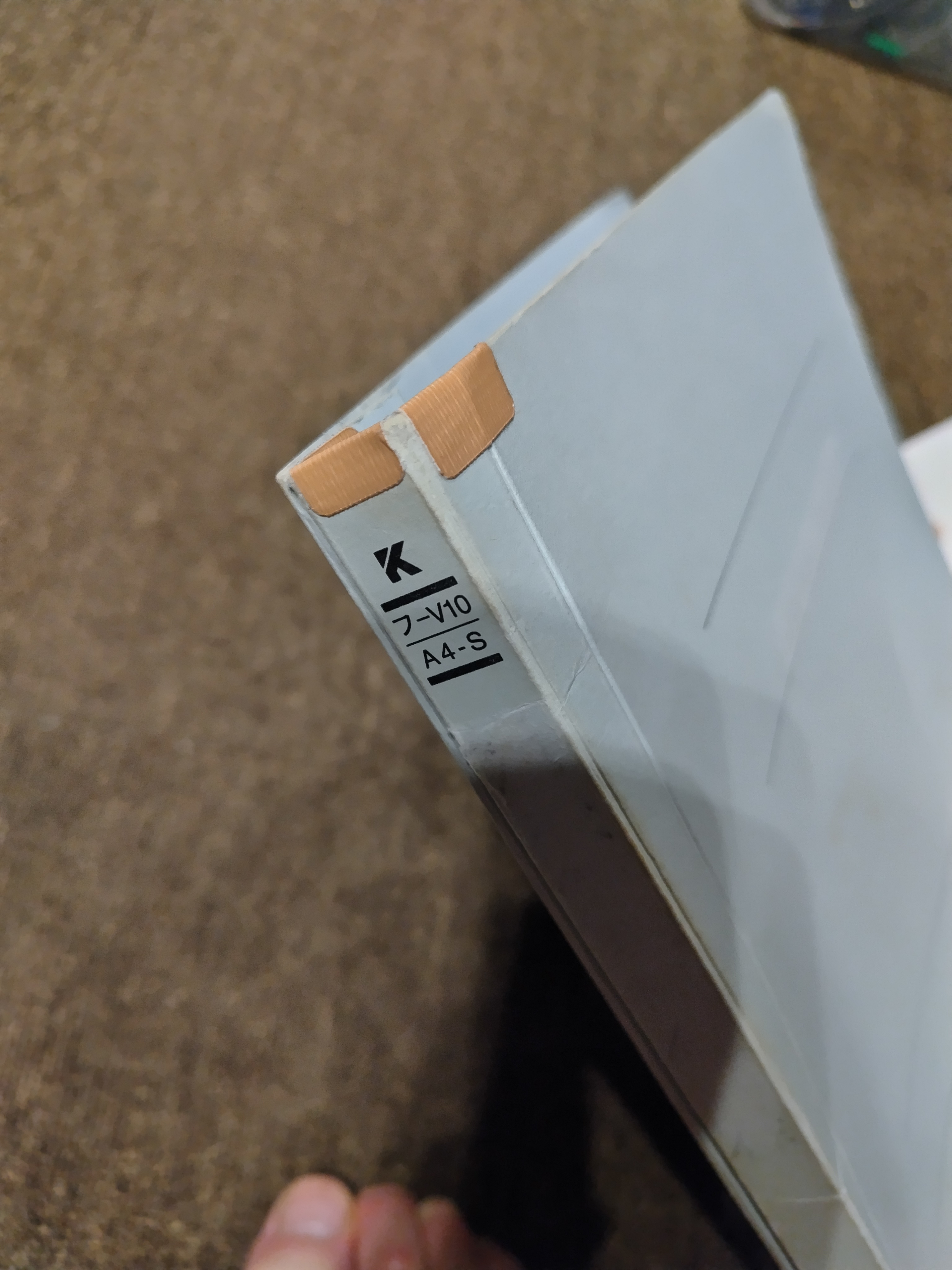 2026/04/20 ほしい募集中 フラットファイル補強シール カズカズ フラットファイルの背表紙の上部が破れやすいので、布テープをレーザーカットして補強用のシールを作りました。自作は面倒なので製品にして欲しいです。