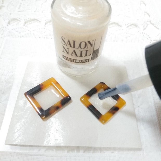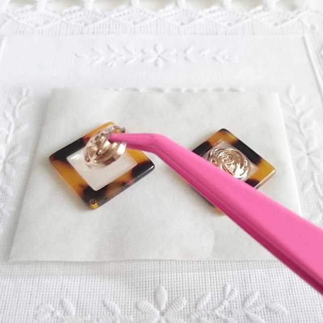 出来上がったべっ甲パーツを裏返し、接着剤またはUVレジンでイヤリング金具を貼りつけます。金具の上からUVレジンでコーティングすると強度が上がります。