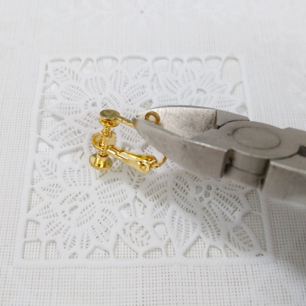 今回はダイソーのイヤリング金具を使用しました。カンがついていて貼り付けの際に邪魔になってしまうのでニッパーで切り取っておきます。