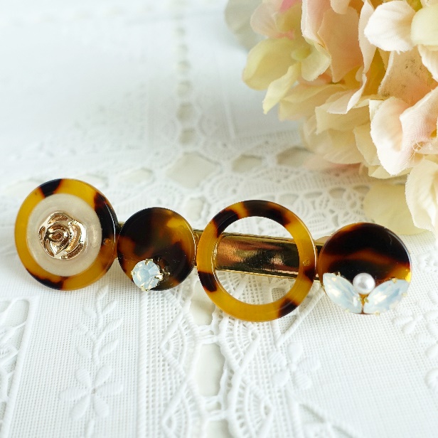 このヘアクリップに先ほどと同じ要領で作ったモチーフ入りのパーツや、ビジューでアレンジしたパーツを接着剤で貼り付けるだけで個性的なヘアクリップに。