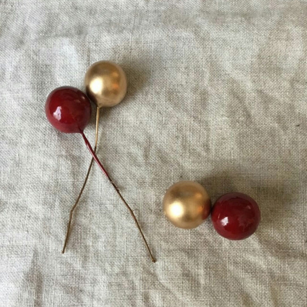 金色赤色のボールと先ほどのリボン、そしてユーカリの実等のパーツをモスリースへグルーガンで貼り付けていきます。ここはオリジナティの見せどころ!