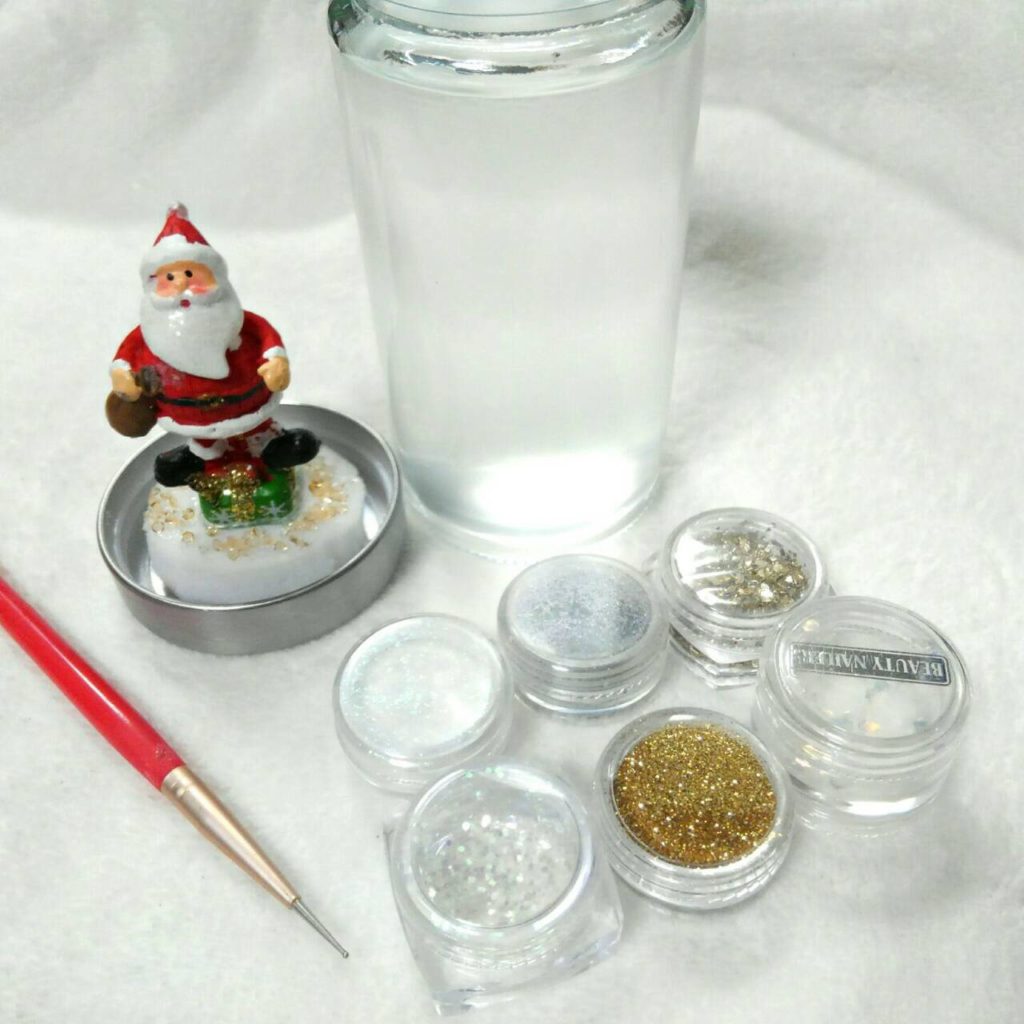 次にお好みのラメやパウダーを入れていきます。入れすぎるとオブジェが見えなくなってしまうので少しづつ入れてはかき混ぜ、ラメの落ち具合を確認しながら足していくと分かりやすいです。