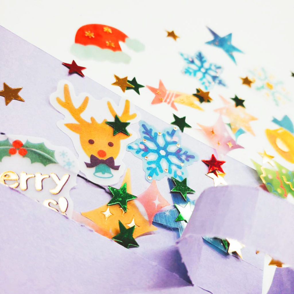 今回ご紹介するのは100円ショップのアイテムで作るシェイカーカード。カードの中にスパンコールやビーズを入れてカシャカシャ振って楽しいカードです。そこにプラスワン。カードの裏をペリペリ開封すると中のシャカシャカが取り出せるサプライズをしかけました。フレークシールを中に入れれば、カードを飾った後はシールをつかえて2度楽しい!作る人も貰う人もワクワクするようなカードです。