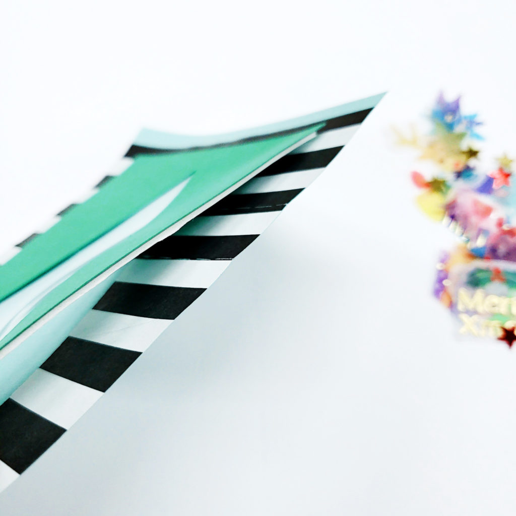 ⑦両面テープを3辺剥がし、用意した台紙(この場合水色の画用紙にボーダーの折り紙を貼ったもの)に貼り付けます。