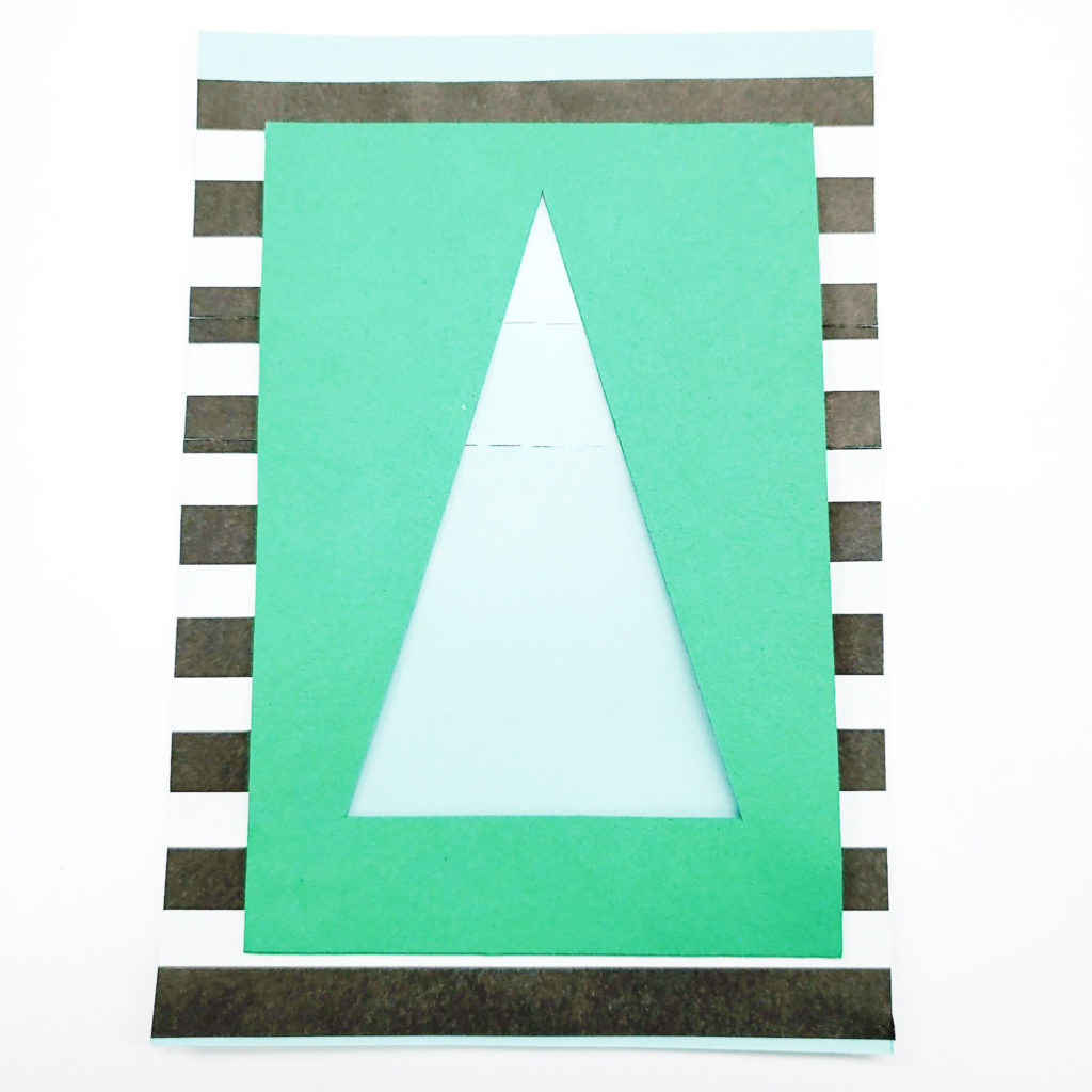 折り紙(モノトーンボーダー)に先ほどの窓よりも少し大きい窓をあけ、別の画用紙(ブルー)に貼ります。