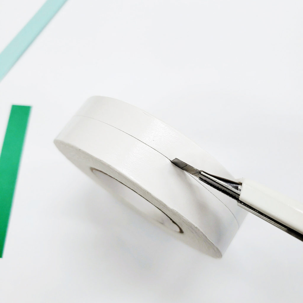 細い場所に貼りたいのにテープの幅が広い。そんな時は巻き状態のまま写真のようにカッターをいれるのがオススメ。