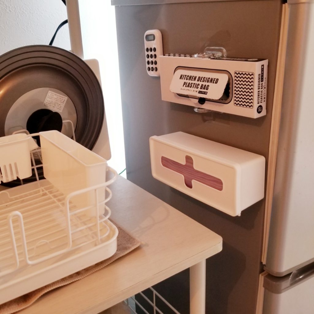 買ってきたパッケージそのまま、冷蔵庫横も有効活用できます。