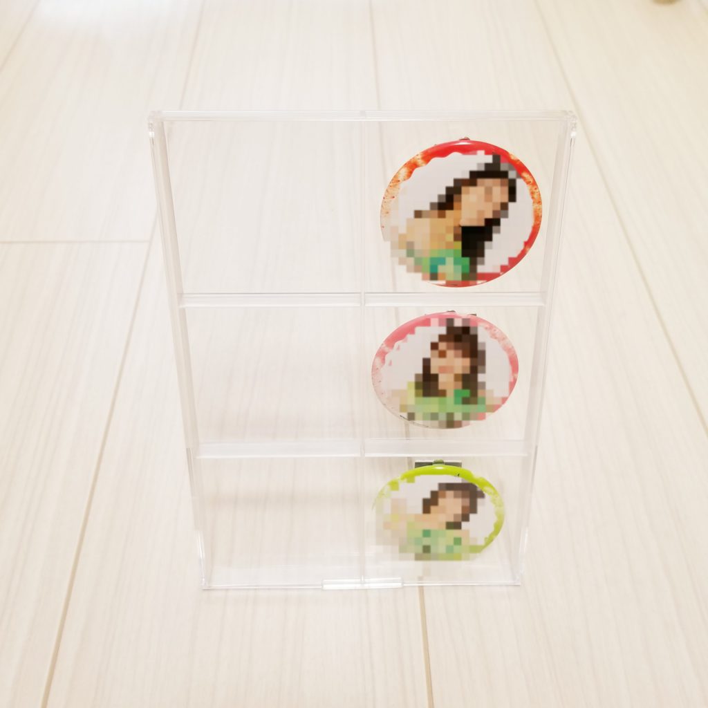 これをつぶしてディスプレイケースの背面に貼れば、缶バッジをつるして収納できます。