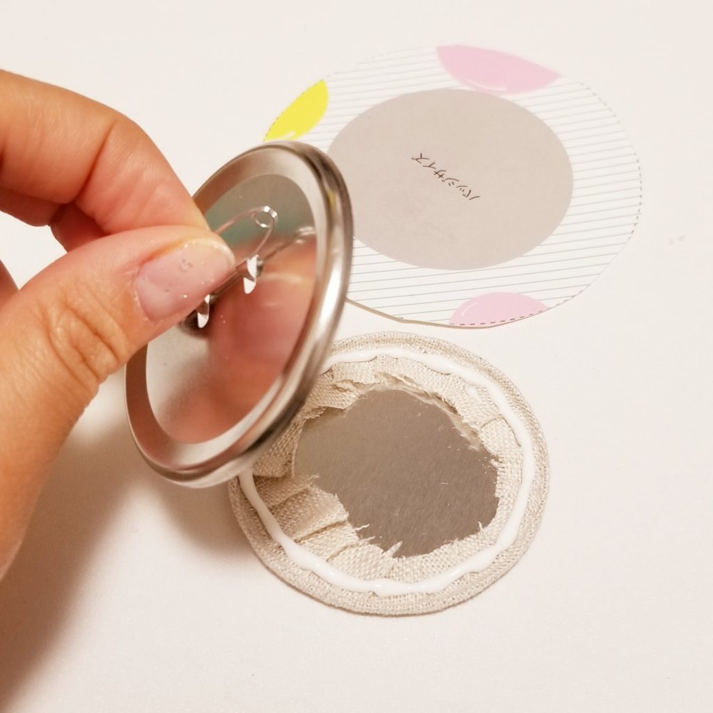 2、缶バッジのオモテになるパーツを裏返し、フチまでしっかり接着材をぬります。