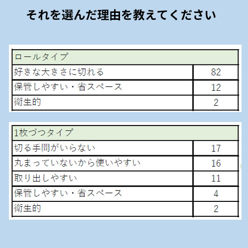 一方の1枚ずつタイプは「切る手間がいらない」「丸まっていないから使いやすい」という理由が多数だったため、こちらは毎回の使いやすさやさらなる利便性を求めているユーザーによる回答が多いという仮説が立てられる。