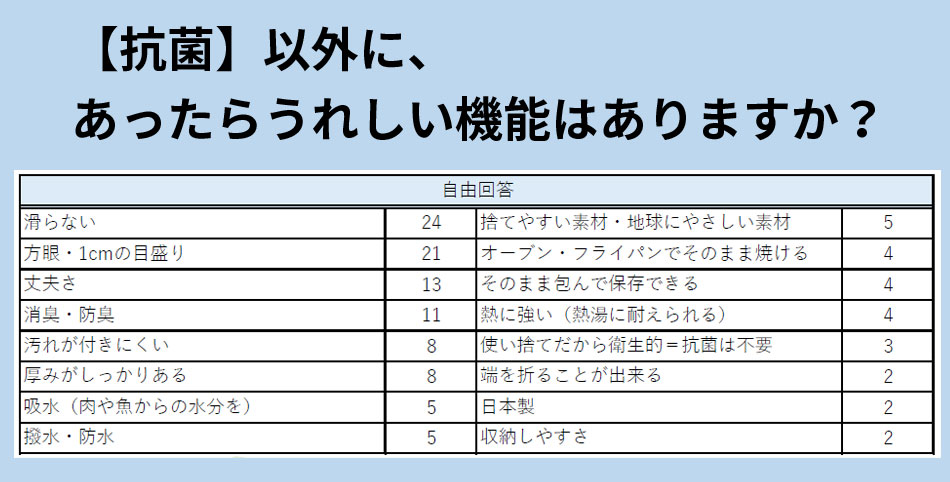 「抗菌」以外に欲しい機能を聞いてみると、「滑らない」という意見が一番多かった。これは生肉や魚を切るときに素材の脂や皮によって滑り、うまく切れないという普遍的な悩みを浮き彫りにするものであったように思える。また、次点で多かった「方眼・1cmの目盛り」の機能に関しては過去に行ったクッキングペーパーなどの他の調理グッズのアンケートに対しても多く寄せられた声であったため、切る(調理)ことに対する隠れたニーズがあるのでは?という新たな研究点も浮かび上がった。