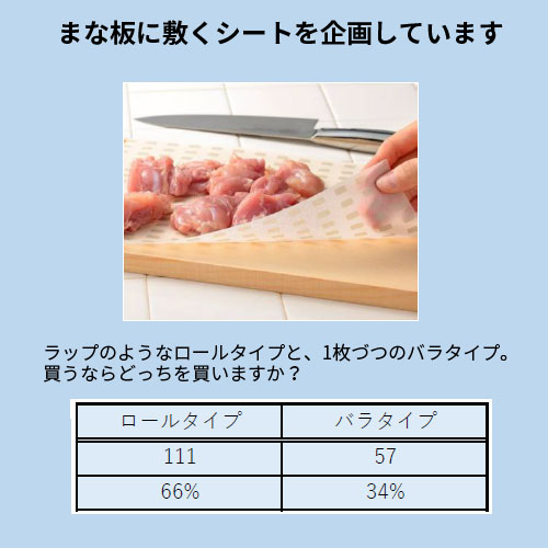 まずはロールタイプと1枚ずつのバラタイプ、どちらが良いかという質問。これに対してロールタイプが6割以上の支持を得た。(個人的にはバラタイプのほうが人気なのではと思っていたため改めてアンケートの重要さを知った)