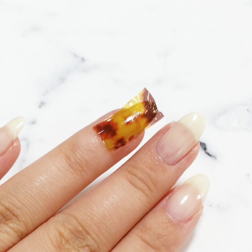3. カットしたシールを柄を下にして爪に乗せ、濡らした綿棒でこすってゆっくりはがします。