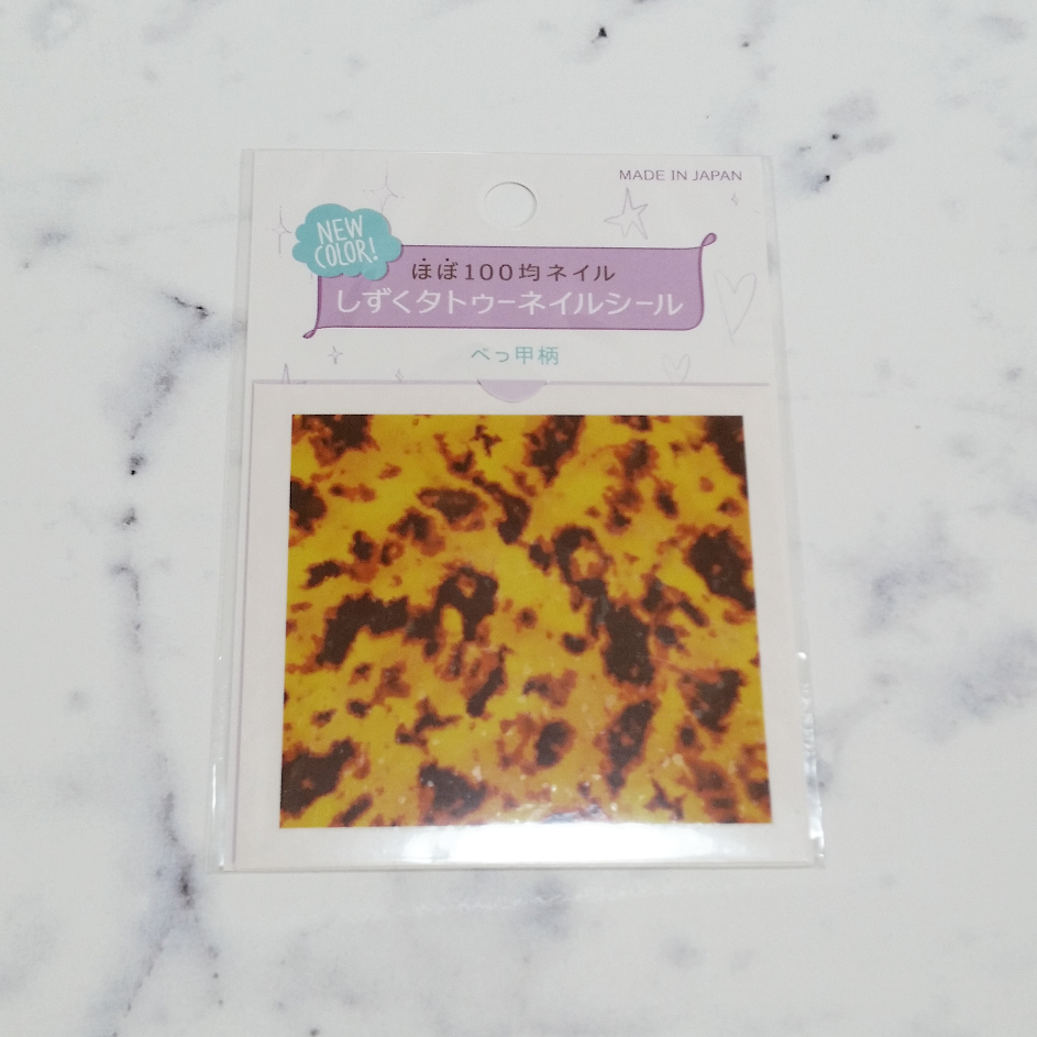 今回はキャンドゥで販売されている「しずくタトゥーネイルシール」を使った簡単なべっ甲ネイルを紹介します。