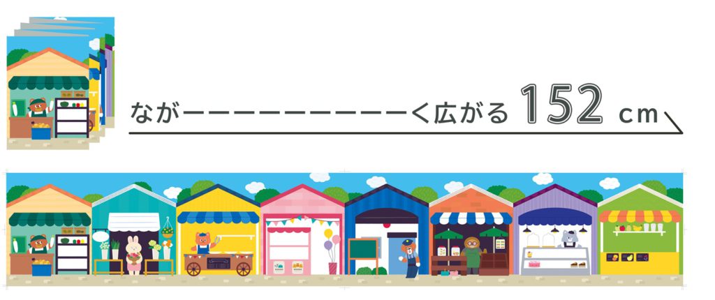 横に広げると街やお部屋の情景がつながり、みんなで同じ世界観を楽しめるのが大きな魅力です。