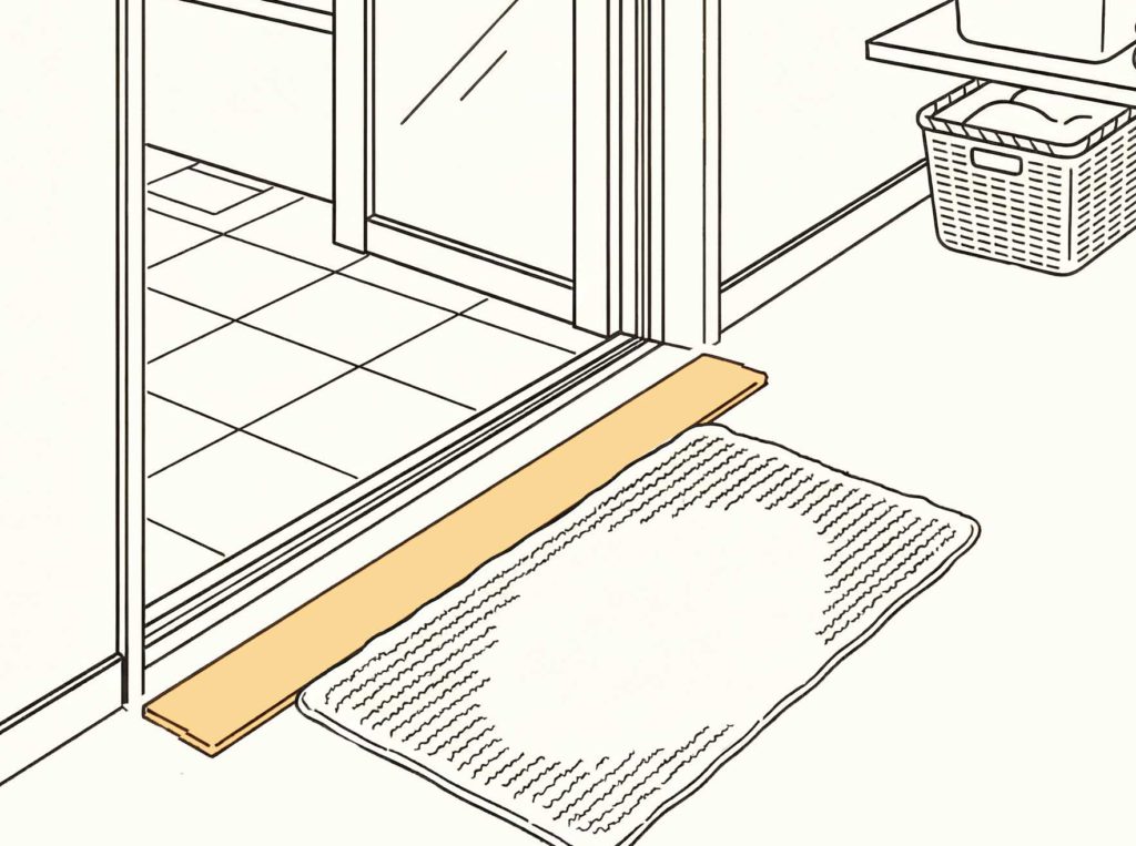 浴室入口とバスマットのすき間に“置くだけ”。吸着面が床にぴたっとくっつき、入浴後の水滴が広がるのを防いでくれます。